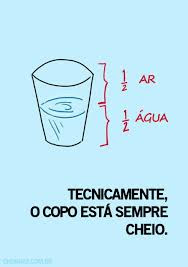 Todos conhecem, com certeza, essa metáfora, incontornável, utilizada tanto em técnicas de vendas, como em reflexões religiosas ou espirituais e, até mesmo, terapeuticamente, que faz a analogia entre a forma como vemos o copo, meio cheio ou meio vazio, e a forma como olhamos a vida.