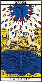 Simbolismo: os dois cachorros (instintos) recebendo o alimento da Lua (imaginação) recordam os perigos que envolvem o espírito e o intelecto quando se submetem ao domínio das paixões e se deixam levar pela fantasia. Algumas das interpretações: viagens pela água. Mudanças. Decepções. Incertezas. Nascimento de um menino. Necessidade de autoconhecimento. Terapias. A atividade e a inspiração vencem a letargia. Triunfo sobre os obstáculos. A Lua marca mudanças, decepções ou inimigos ocultos, dispostos a perturbar nossas vidas. Mas também pode significar viagens pela água e triunfo sobre os obstáculos. Trata-se de uma carta dual. A carta da Lua indica que pode existir uma relação com a mãe ou a própria função maternal será transcendente. A objetividade e o abandono de fantasias infantis lhe permitirão superar as decepções e consolidar uma situação familiar harmónica.